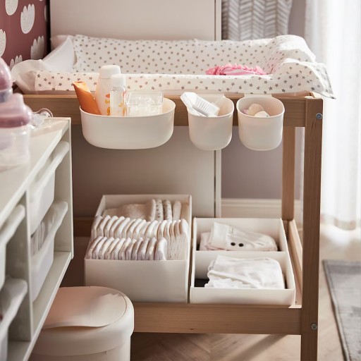 У цих кошиках на пеленальному столику все під рукою - від пелюшок і мочалок до засобів по догляду за шкірою та рушників. Ідеально підходить, якщо у вас жвава дитина, яка потребує постійної уваги. Кошики економлять місце, вішаючи їх на край пеленального столика.