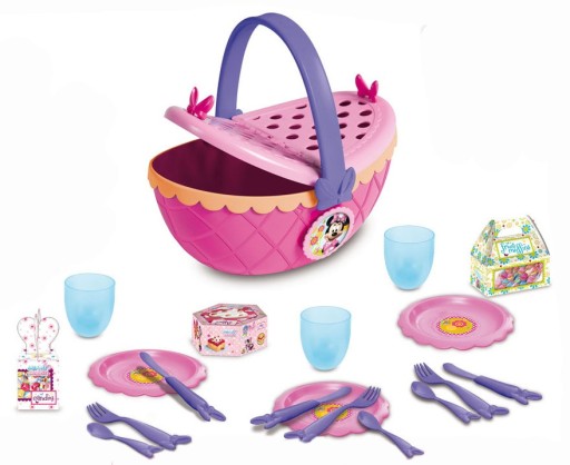 Є в кошику 3набори столових приладів і посуду. Тут ви знайдете 3 милі ніжно-рожеві тарілки, 3 набори столових приладів фіолетового кольору, ручки яких прикрашені бантом Мінні Маус (ніж, виделка і ложка), і 3 чашки ½ Kitne, все зроблено з високоякісного пластику. Крім того, в кошику ви знайдете 3 милих паперових коробки для цукерок Міккі Мауса.