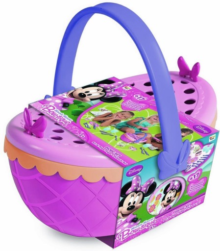 Цей милий кошик для пікніка Мінні Маус,Виготовлений відомою та шанованою компанією IMC Toys, він має чудовий рожевий колір у пастельних відтінках з м’ятною кришкою та прикрашений двома симпатичними пластиковими бантиками, як у Мінні. Ручка цього кошика також рожева, а збоку самого кошика є миле зображення Мінні Маус