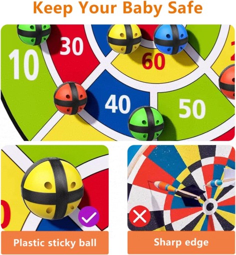 Більший розмір означає вищий показник попадання та більше розваг для дітей.Поставляється з 12 липкими кульками, 6 липкими дротиками та 2 липкими гачками.