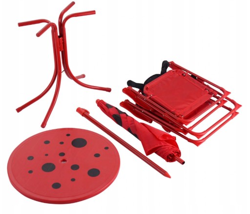 - Завдяки такому комплекту меблів ви створите практичний і функціональний простір для дітей, який складається з: столу, парасольки і двох стільців.