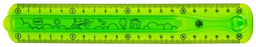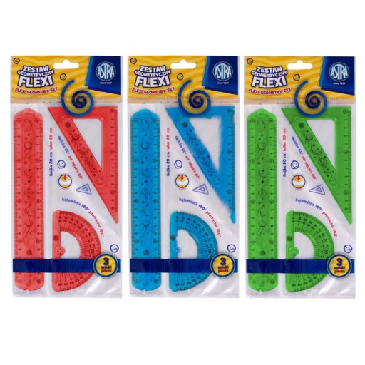 У набір входять 3 елементи: лінійка 20 см, косинець, транспортир, виготовлені зі спеціального, гнучкого матеріалу - стійкого до зламів.