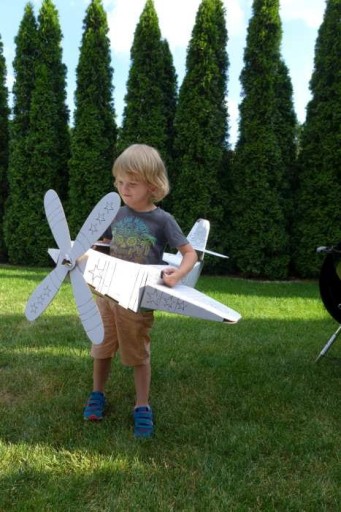 Літак з картону, всередині якого може сидіти пілот.Літак можна декорувати після побудови. Креативну екологічну іграшку можна розмалювати фарбами, олівцями та фломастерами відповідно до фантазії дитини.