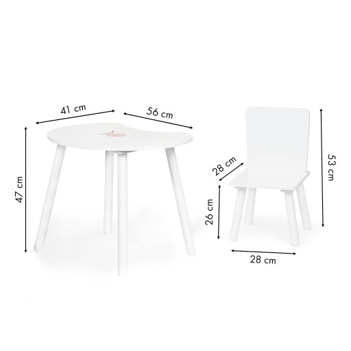 Чудовий набір для всіх малюків, завдяки простій формі він ідеально впишеться в інтер'єр дитячої кімнати, ігрової кімнати або кімнати очікування. Стіл має міцні соснові ніжки, які надають йому стійкості, а стільниця виготовлена з МДФ, що робить його простим у догляді та стійким до пошкоджень/подряпин. Набір доповнений двома стійкими і зручними кріслами.