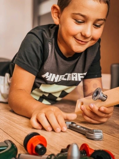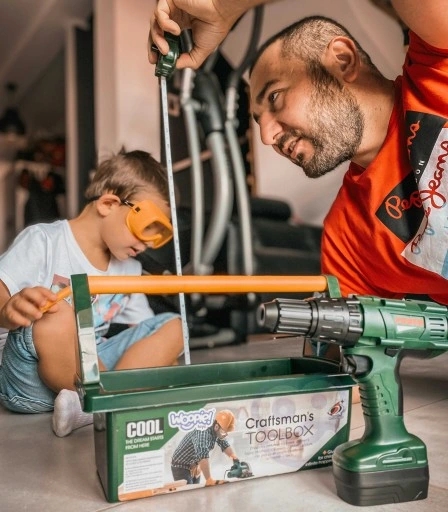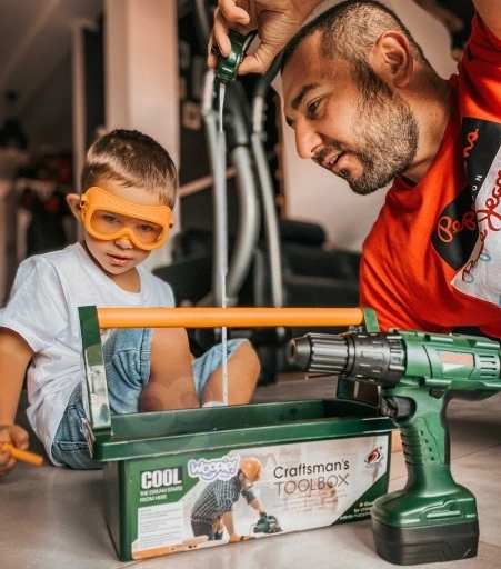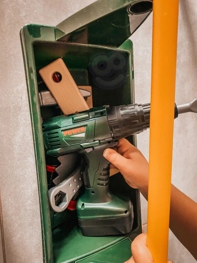 Ящик для інструментів з викруткою та дрилембула створена компанією, яку люблять дітиВУПІ. У набір входитьтемно-зелений, місткий ящик для інструментів zкомфортно,жовта рука і15 предметів. Серед інструментів діти знайдутьдриль-шуруповерт акумуляторний для акумуляторів з3 змінні наконечники. Дриль/шуруповерт ідеально імітує справжній верстат, завдякизвуки та обертовий гвинт. Крім того, в набір входятьпилка зі зручною рукояткою, молоток, гайковий ключ, дві пластикові дошки з отворами для закручування шурупів (4 в наборі) Âабо забивання цвяхів (2 включені). Цей набір принесе велике задоволення кожному маленькому любителю саморобки, одночасно сприяючи розвитку ручних навичок.