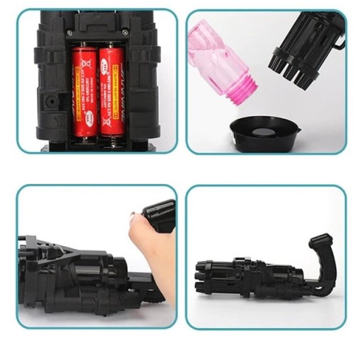Кулемет має 8 отворів для бульбашок, які можуть видувати сотні бульбашок за хвилину. Цю машину для бульбашок можна використовувати як літній вітряк зі знятою головкою бульбашок, коли ви відчуваєте втому після погоні за бульбашками.