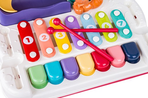 - Цимбали- чудовий вибір для малюка, який цікавиться світом музики. Яскраві кольори та звукові ефекти залучають до музичного задоволення, а 7 металевих пластин дозволяють пізнати діапазон звуків. Ви можете грати як стандартними паличками, так і кольоровими кнопками.