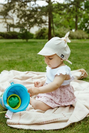 - Ідеальний матеріал для літаâ бандана була зроблена в100%сбавовняний муслін. Муслін завдяки своїй вільній і відкритій структурівін надзвичайно повітряний і легкий- ніжно огортає голову малюка, захищаючи її від сонця та перегріву.