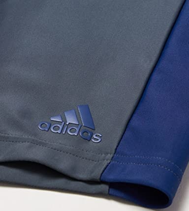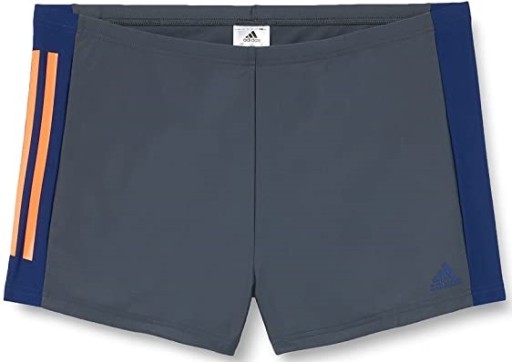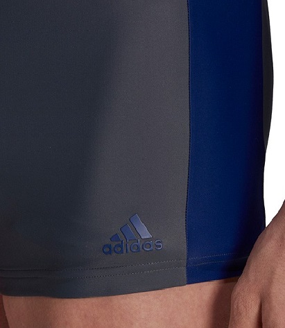 Сірі боксери з темно-синіми аксесуарами. З правого боку 3 фірмові смуги, а з лівого боку прогумований логотип ADIDAS. Купальники мають еластичний пояс і регульовану зав'язку.