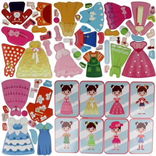 Творча іграшка складається з буклету, карток із готовими пропозиціями стилю та набору з 73 магнітних пазлів у формі різноманітних елементів одягу та різних аксесуарів.
