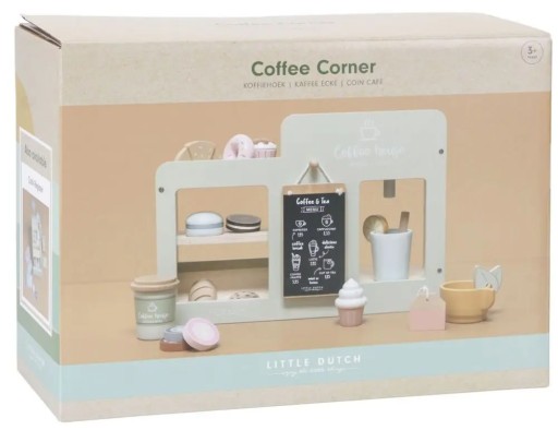 Дитяче кафе Little Dutch приймає як дітей, так і дорослих, тут можна приготувати та подати каву чи чай, смачне печиво чи кекси, а також взяти напої з собою. Кафе двостороннє, тож діти можуть зіграти справжніх гостей та бариста, повеселитися з братами та сестрами, друзями, батьками чи пригостити смаколиками для ляльок та ведмедиків. У кавовому куточку є кавоварка та чайник, місце для всіх чашок та інших необхідних речей, вітрина для закусок та дошка з меню. Набір містить багато вишуканих елементів, серед яких: круасани, пончики, чайні пакетики та капсули з різними видами кави подарують багато годин чудового задоволення.