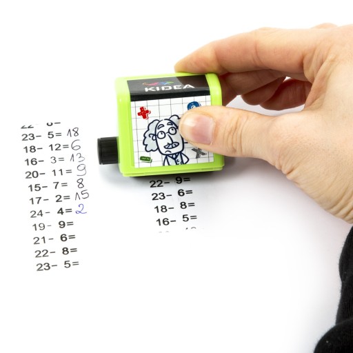 Математичний принтердля навчання kide множення. Цей унікальний роликовий штамп дозволяє створювати до100 різних комбінаційматематичні операції - просто змініть налаштування чисел за допомогою ручки.