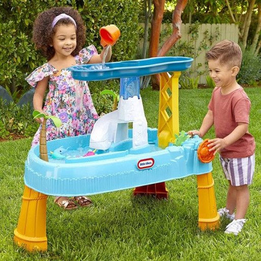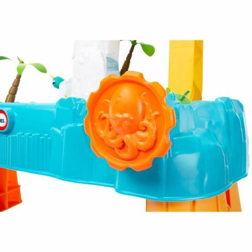Водний майданчик Little Tikes Island з водоспадом і гіркою дозволяє дітям розгулятися уяві та весело провести час на свіжому повітрі. На цьому великому столі з водою з водоспадом багато занять одночасно для кількох дітей. Компанію їм складуть милі тварини: акула і два нарвали. Вони можуть налити воду зверху і спостерігати, як вона стікає в лагуну внизу, створюючи водоспад. Посередині верхнього рівня є гірка і секретний тунель