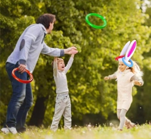 Наша унікальна гра з колесом підкидання стане ідеальним подарунком для кожної дитини, яка любить усі види рухливих ігор. Це чудовий спосіб провести час із родиною чи друзями. Набір складається з основи (заячі вушка) і чотирьох кілець для метання (кілець). Завдяки тому, що набір надувається, ви можете брати його всюди з собою: