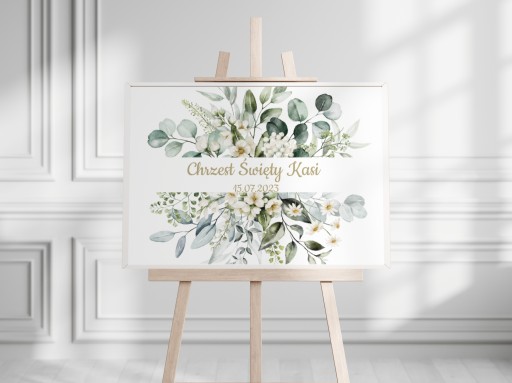 Przedmiotem oferty jest plakat na Chrzest Święty w rozmiarze 50 cm x 70 cm. Plakat poziomy, personalizowany, znajduje się na nim napis z imieniem dziecka i datą uroczystości wszystko przyozdobione pięknymi kwiatami.