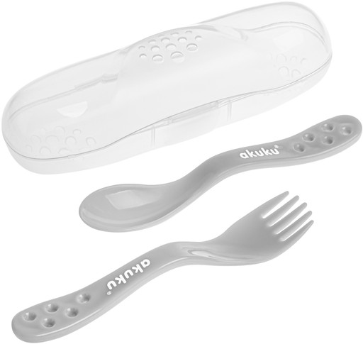 Набір фігурних столових приборів: виделка та ложка. Оснащені практичним чохлом, завдяки якому вони добре працюватимуть поза домом - на прогулянках і в подорожах. Виготовлений з безпечних високоякісних матеріалів, призначених для контакту з харчовими продуктами. Округлі форми столових приборів ідеально адаптовані до ніжних ясен маленької дитини. Продукт повністю не містить бісфенолу А (0% BPA).