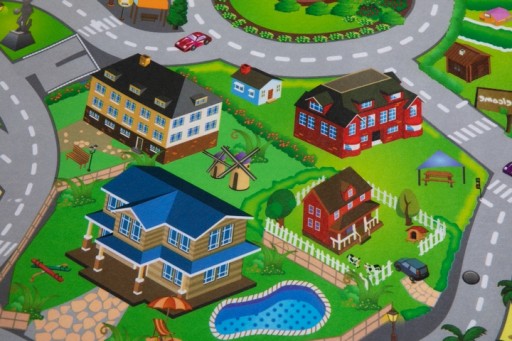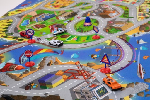 Килимок розвиває уяву, а кольори та малюнки надихають, а густа мережа вулиць не дає нудьгувати. Килимок ідеально підходить для дітей старше 3 років - для гри з однолітками або батьками. М'який матеріал забезпечує ізоляцію від землі, а зручна упаковка дозволяє легко заховати весь комплект. Ідеально підходить для подарунка.