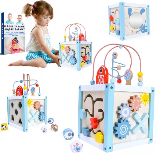 - З боків стіни малюк може грати сортером, підбираючи кубики відповідної форми. Наступні стінки куба мають дзеркало, лабіринт і шестерінки, що обертаються.