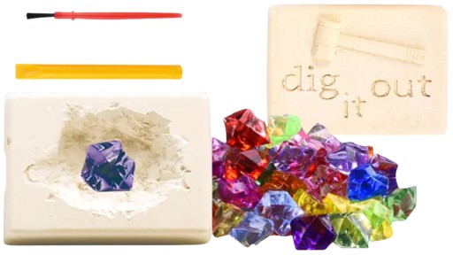 Діти можуть взяти на себе роль маленького археолога і використовуватиспеціалізовані засобивідкриватикрасиві діаманти та кристализаховані в землі. Це весело, щорозвиваєтьсяобидваручні навички, Щонавички логічного мислення.