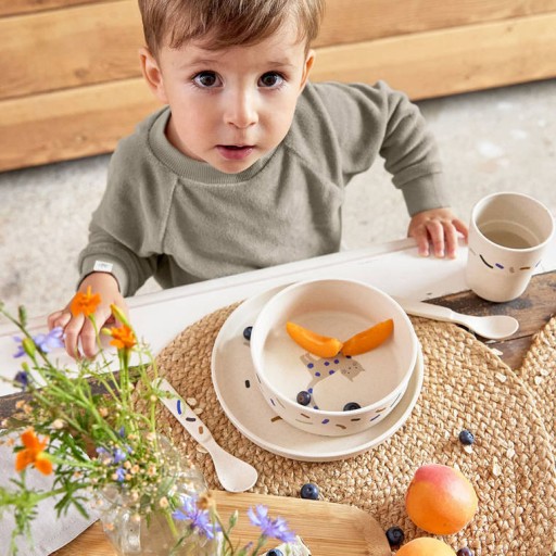 Набір красивого посуду з колекції Little Mateys німецького бренду LASSIG. Він складається з великої тарілки, миски, кухля та ложки — усі елементи дуже світлого меланжево-бежевого кольору з барвистим малюнком, що імітує їжу домашніх тварин, і зображеннями цих істот на кожному з них. На тарілці зображена плямиста такса, на дні миски - кошеня з блакитними плямами, на дні чашки - морська свинка з плямами, а на ручці ложки - кролик з блакитним хвостиком. Набір виготовлено з матеріалів найвищої якості - комбінації поліпропілену та целюлози - твердих, стійких, небитких і придатних для контакту з харчовими продуктами. Посуд має протиковзке покриття дна, а ложка - правильно профільовану ручку і головку. Набір ідеально підходить для дітей старше 1 року, які вчаться самостійно пити та їсти (що полегшується, зокрема, завдяки вищому краю та вужчому дну посуду).