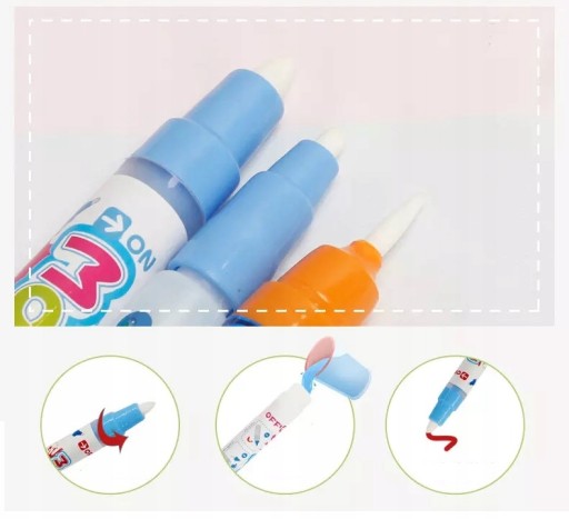 ЯК ПРАЦЮЄ ВОДНИЙ МАТ? Принцип роботи водяного килимка надзвичайно простий - матеріал, змочений водою, робить на ньому видимі кольори. Після того, як ви напишете щось водяними фломастерами чи штампом, візерунки залишатимуться чіткими протягом кількох хвилин, а потім зникнуть. Завдяки цьому правильно зберігані килимки можна використовувати нескінченно довго! ЯК КОРИСТУВАТИСЯ ВОДЯНИМИ РУЧКАМИ Відкрутіть кінчик ручки Налийте води Закрийте кінчик Фарбуйте! ЯК КОРИСТУВАТИСЯ ПЕЧАТКАМИ Налийте воду в ємність Опустіть штамп у ємність Штамп!