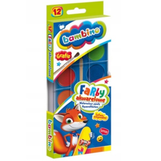 Акварельні фарби фпляшки з водою у формі сухих таблеток,які після зволоження готові до використання. Ці фарби призначені для дітей і підлітків, які хочуть створювати більш художньо просунуті роботи, переважно пейзажі чи портрети. Акварелі Bambino дозволяють отриматиефекти яскравості, делікатності, розмитості контурів, гри світла.Їх можна використовувати в техніках, поєднаних з плакатними фарбами, темперою або різними видами олівців. Особливо виділяється акварельна фарба Bambinoбагата палітра інтенсивних кольорів, якість і безпека використання. Вони виробляються відповідно до директиви Європейського парламенту та Ради щодо безпеки іграшок та постанови Міністерства економіки щодо основних вимог до іграшок.
