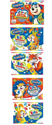 Блок містить 10 кольорових карток вагою 160 г/м2. Картки розфарбовані в масі в кольори жовтий, лососевий, рожевий, оранжевий, фіолетовий, червоний, світло-зелений, темно-зелений, світло-блакитний, темно-синій.Крейдяне покриття вагою 115 г/м2 використовує новітні мотиви дизайну BAMBINO. Щоб підкреслити якість обробки, кришка додатково полірована.Весь закріплений картонною основою.