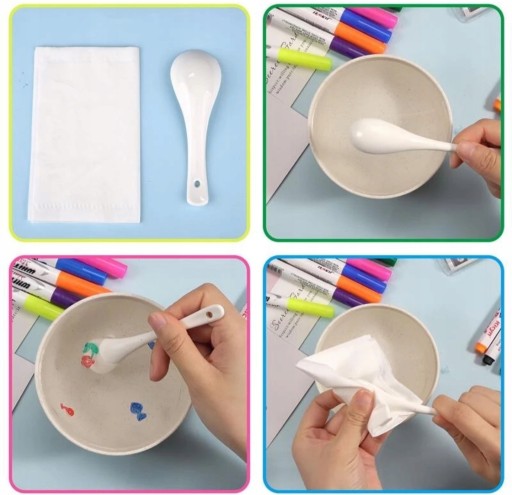 Найцікавіше починається, коли ви малюєте малюнок на зворотному боці ложки, наприклад, зірку, трохи чекаєте й занурюєте її в миску з водою під кутом приблизно 70° плавно нахиліть приблизно до 90°.Маємо фінальний ефект водної картини. Малюнок, що стікає по ложці і ніжно хвилюється, вразить як дітей різного віку, так і дорослих.