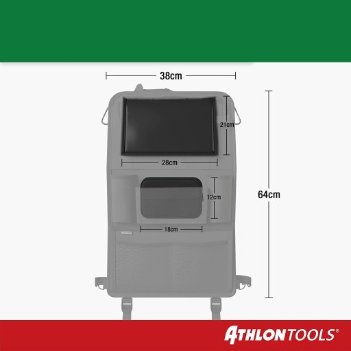 Органайзер для автомобільного сидіння Athlon Tools оснащений безліччю різних кишень, гачків, сіток і тримачів для напоїв. Діти можуть легко сховати свої улюблені м'які іграшки, іграшки, книжки, зошити, приладдя для малювання, дорожнє приладдя та багато іншого. Завдяки цьому навіть тривалі поїздки залишаються приємними та менш стомлюючими.