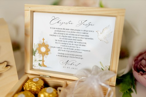 Відкривши коробку, ми бачимо красиву присвяту зі словами подяки хресним батькам і ставимо ім'я та дату хрещення вашої дитини, щоб хресні завжди пам'ятали цей прекрасний день.