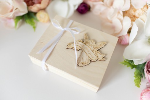 Унікальний сувенір для кумів, який був прикрашений ніжною білою стрічкою та дерев'яним янголом, на якому ми вигравірували слова "Сувенір на Святе Хрещення"