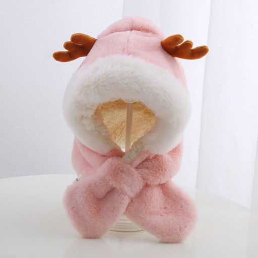 Дитяча плюшева шапка-шарф для віку 1-7 років - світло-рожева з оленячими вушками
