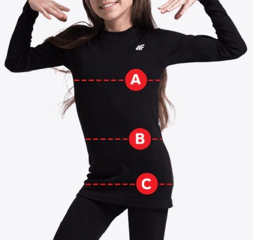 Обхват талії (B) – виміряйте найвищу частину талії, тримаючи рулетку горизонтально.