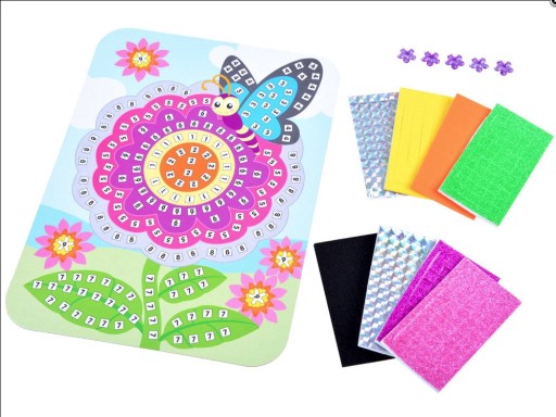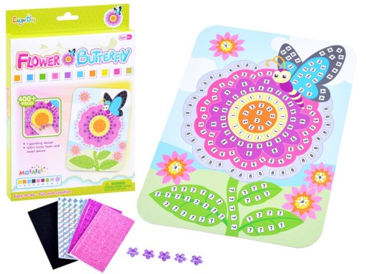 Квіткова мозаїка з метеликомце творчий набір для дітей, які люблять творчість. Набір, що складається з барвистої картини, яку потрібно склеїти квадратами з пінопласту, звичайно, регулюючи кольори та форми.
