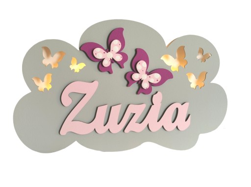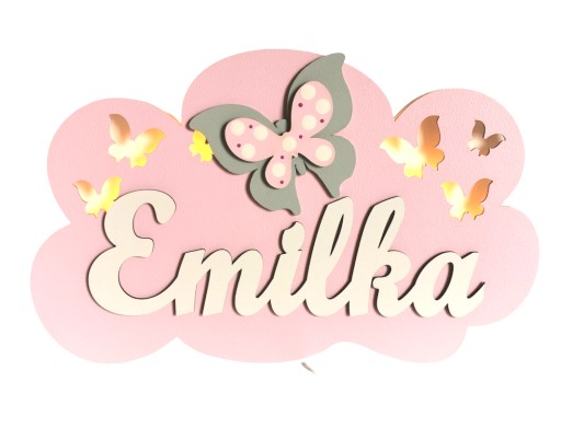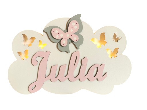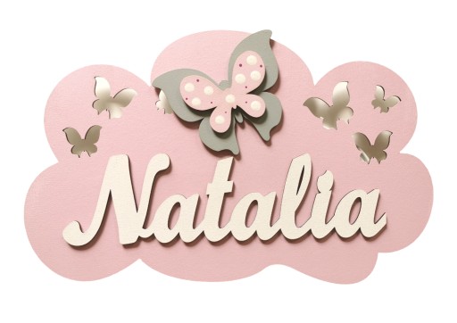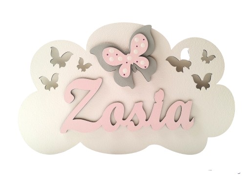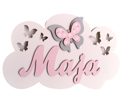 Світильник має вирізані ажурні елементи у вигляді зірок і метеликів. Крім того, на кожній хмаринці ми розміщуємо напис з ім'ям вашої дитини та один декор 10 см на вибір: метелик, сова, ведмедик.