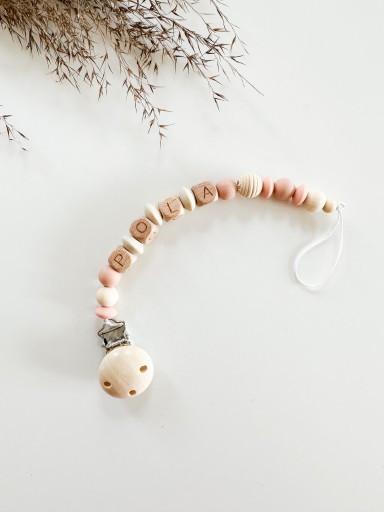 Підвіска виготовлена з міцного металу і дерев'яної кліпси, що дозволяє міцно закріпити підвіску на одязі малюка.