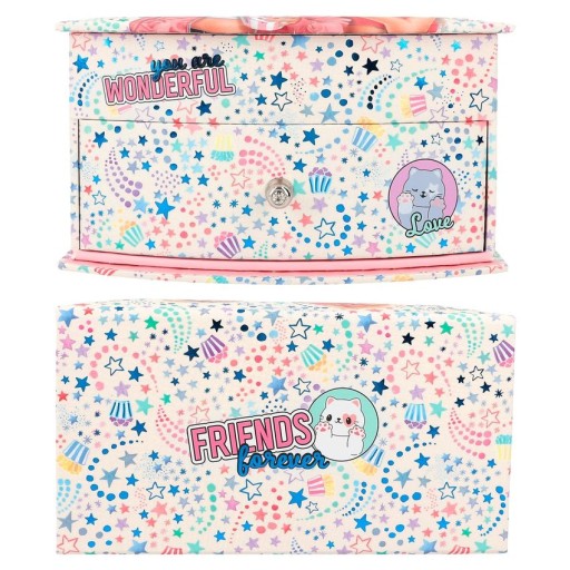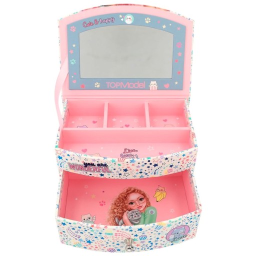 Особисті скарби: маленька скринька для прикрас TOPModel Cutie Star з милими зірочками, веселими іконками попкорну, милими кошенятами та стильним модельним принтом, дзеркальцем у відкидній кришці, розділеним основним відділенням і великою шухлядою з кнопкою з гірського кришталю.