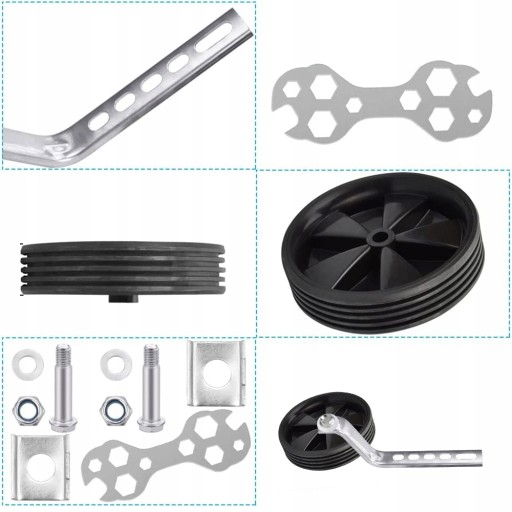 Набір виробів із напрямними колесами: виріб складається з 1 пари чорних коліс, 2 опорних рам і відповідних гвинтів, а також 1 багатофункціонального ключа. Велосипедний стабілізатор виготовлено з високоякісного пластику, який забезпечує додаткову стабільність і безпеку, щоб діти були в безпеці, міцні та довговічні.