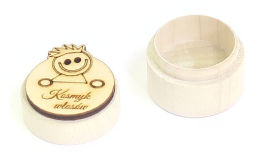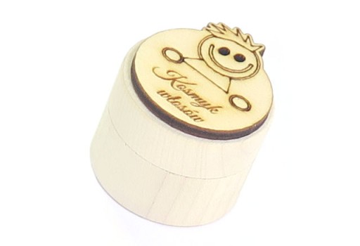 Пропонуємо сувенірну круглу коробочку для пасма волосся нашої дитини з декором усміхненого хлопчика.