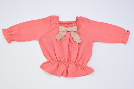 - Коричнева блузка з ниток з декоративним бантом бежевого кольору. Ніжна гумка на талії, на кінцях рукавів і в горловині.