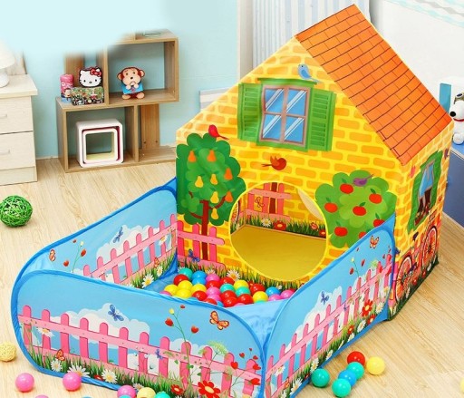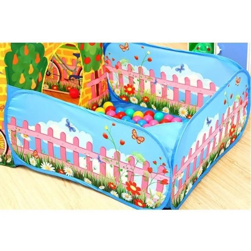 За формою виріб нагадує будиночок - має дах. Вся тема намету стилізована під ферму з садом, який служить сухим басейном для дітей. Намет практичний і легко збирається. Завдяки легкій раміЛегко переносити його з місця на місце.