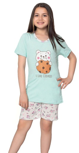 Бавовняна піжама, що складається з футболки м’ятного кольору з короткими рукавами, на якій зображено ведмедика з печивом. Шорти кольору екрю у ведмедиків.