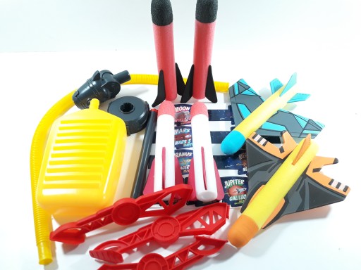 - Іграшки для віку 3, 4, 5, 6+: «Літаюча ракета» — це ідеальний подарунок для дітей будь-якого віку, щоб вирушати на природу та вчитися, розважаючись! У комплект поставки входять 2 пінопластові ракети, 2 світлодіодні ракети, 2 літаки, 10 наклейок, підставка для стартера, пускова установка з повітряним шлангом.
