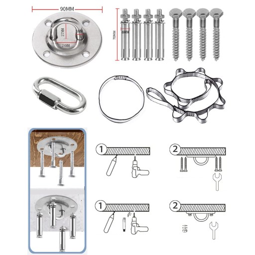 - Його можна використовувати на деревах, підставках для гамаків, дерев’яних і бетонних стелях.