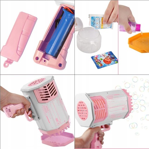 - Бульбашковий пістолет має 69 отворів і може видувати тисячі бульбашок за хвилину, що дозволяє легко наповнювати середовище бульбашками, приносячи радість вам і вашій родині.
