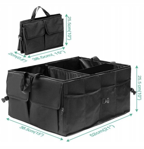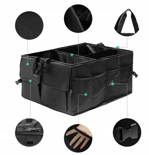 Складний, практичний органайзер для багажника вашого автомобіля, завдяки якому ви будете підтримувати порядок в машині. Органайзер оснащений 3 відділеннями, 4 бічними сітчастими кишенями і 2 кишенями, що закриваються на липучку.