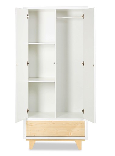 Шафа-купе ЛІДІЯ - це предмет меблів, призначений для функціональності протягом багатьох років. Вишукане поєднання кольорів робить шафу-купе візуально яскравішим будь-яке приміщення. Три полиці, дві штанги і місткий ящик гарантують комфорт у використанні. Напрямні PUSH TO OPEN - це елемент, який полегшує відкриття навіть із зайнятими руками, це ідеальна функція для всіх зайнятих мам! Зовнішній розмір (см): 80x180x50 матеріали: Сосновий ліс МДФ Щит меблевий Особливості та функції: Система PUSH TO OPEN 3 полиці і вішалка для одягу