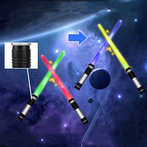 - Включає 2 мечі та 1 подвійний шарнір з подвійним лезом. Натисніть нижній перемикач, щоб активувати режим миготіння, що супроводжується звуками боротьби.