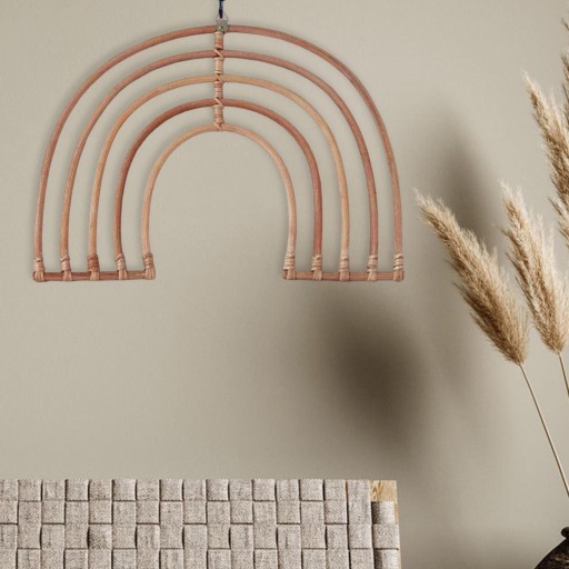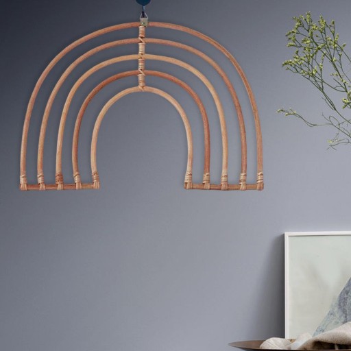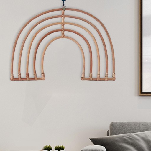 : Веселка з ротанга в богемному стилі, вишукана та красива, елегантна прикраса для дому. Виготовлена з екологічно чистого ротанга. Поверхня гладка та безпечна для дітей. Веселка з ротанга чудово виготовлена вручну, щоб повісити її на стіну дитячої або душову в стилі бохо. Чудово підходить для днів народження, Різдва , дитячі вечірки, ювілеї чи інші свята. Цю веселку можна виставити в дитячій кімнаті, повісивши на стіну за допомогою металевої трикутної вішалки, що входить у комплект, або просто притуливши до стінного твору мистецтва для збільшення розміру