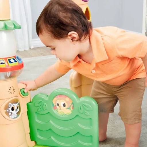 Будиночок на дереві має багато барвистих і привабливих елементів, які заохочують досліджувати та підтримують сенсорний розвиток малюків.